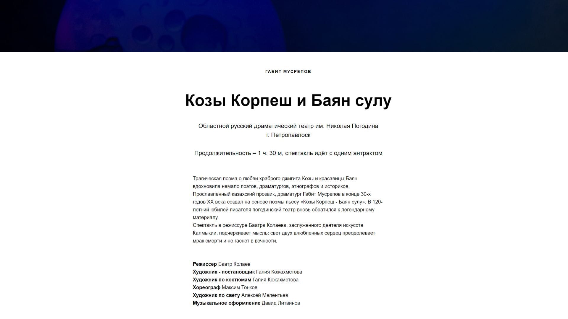 Трагическая поэма о любви храброго джигита Козы и красавицы Баян вдохновила немало поэтов, драматургов, этнографов и историков. Прославленный казахский прозаик, драматург Габит Мусрепов в конце 30-х годов XX века создал на основе поэмы пьесу «Козы Корпеш — Баян сулу». В 120-летний юбилей писателя погодинский театр вновь обратился к легендарному материалу.