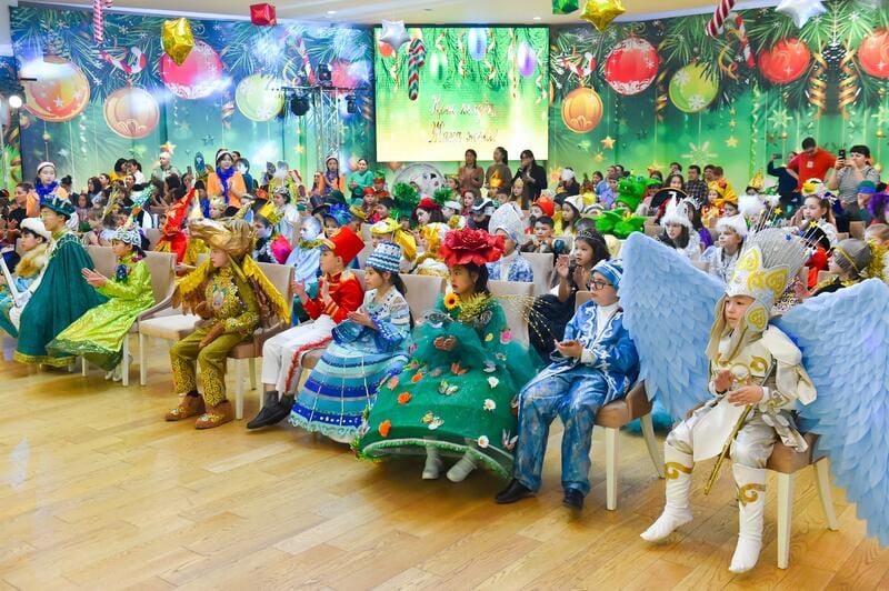 На новогоднем празднике участвовали отличники, призеры олимпиад, ребятишки из многодетных и малообеспеченных семей, сироты и дети с особыми потребностями. Маленькие гости праздника посмотрели праздничное представление и получили подарки от имени Главы Государства.
